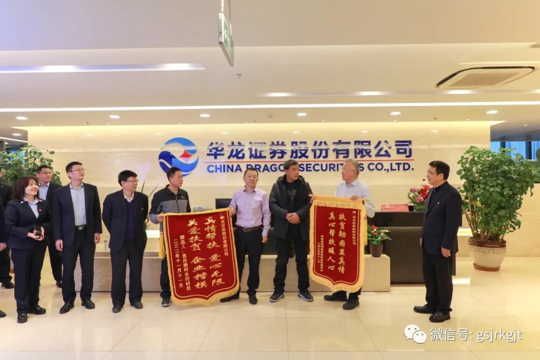 12月1日上午,华龙证券定点帮扶村舟曲县果耶镇吾德村党支部书记黄帮周和真庄磨村党支部书记韩军龙一行向公司赠送“扶贫助困显真情,真心帮扶暖人心”和“真情帮扶、爱心无限,关爱扶贫,企业楷?!苯跗?。金控集团华龙证券党委书记、董事长陈牧原,华龙证券党委副书记、总经理苏金奎代表公司接受锦旗。金控集团党委副书记、总经理雷铁,党委委员、派驻纪检监察组组长刘旺兴,华龙证券在家班子成员及各部门负责人参加了会见。