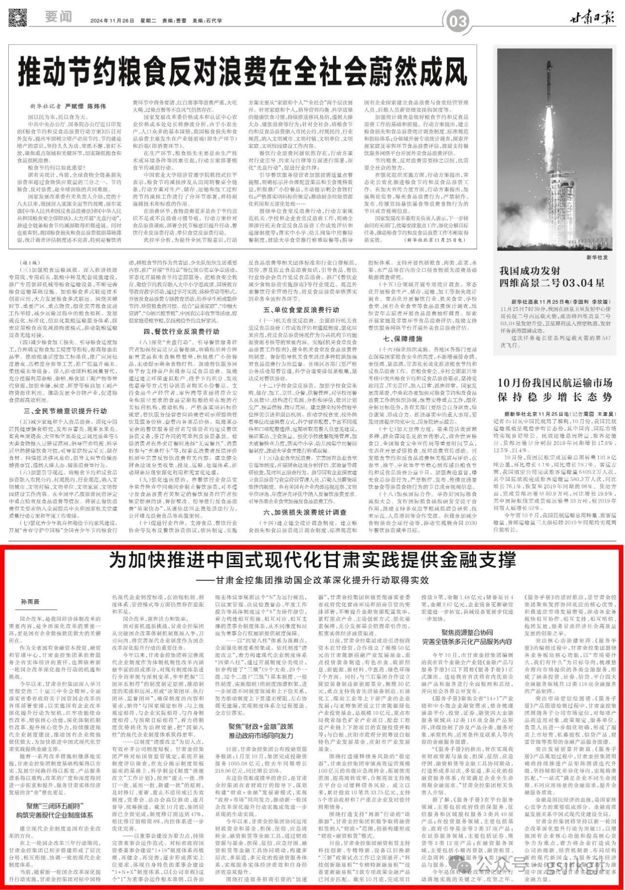 今年以来,甘肃金控集团深入学习贯彻党的二十届三中全会精神,全面落实省委省政府关于国资国企改革的各项部署安排,以实施国有企业改革深化提升行动为契机,扛牢功能使命性改革、增强核心功能,深化体制机制性改革、提升核心竞争力,持续推进现代企业制度建设,推动国有企业做强做优做大,为加快推进中国式现代化甘肃实践提供金融支撑。