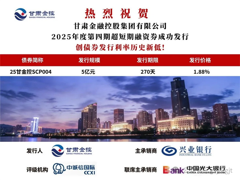2025年6月26日,甘肃金控集团成功发行2025年度第四期超短期融资券“25甘金控SCP004”,规模5亿元,期限270日,票面利率1.88%,创集团债券发行利率历史新低,有助于集团降低融资成本。