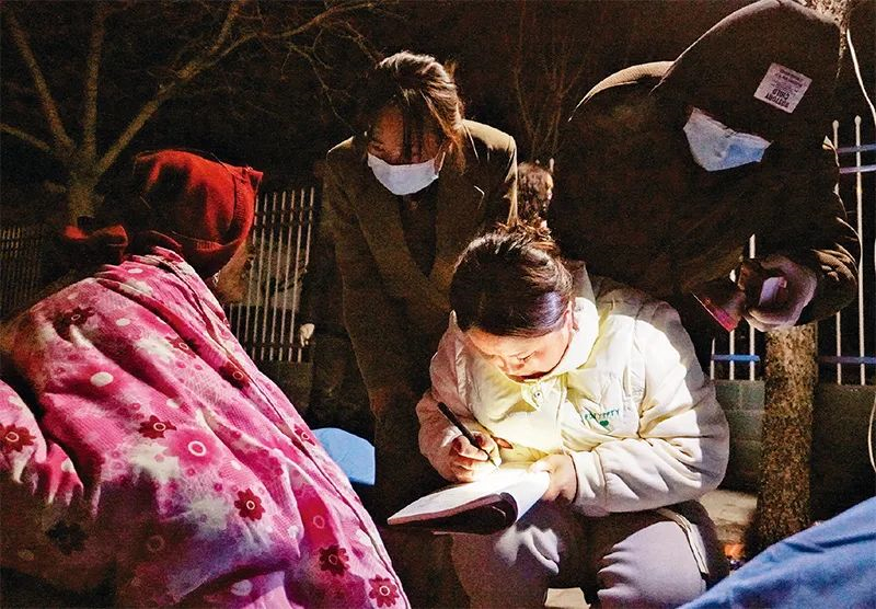 2023年12月19日,在甘肃省积石山县中西医结合医院门口,当地干部在登记受灾群众信息。18日23时59分,甘肃省临夏回族自治州积石山保安族东乡族撒拉族自治县发生6.2级地震。(新华社记者?马希平/摄)