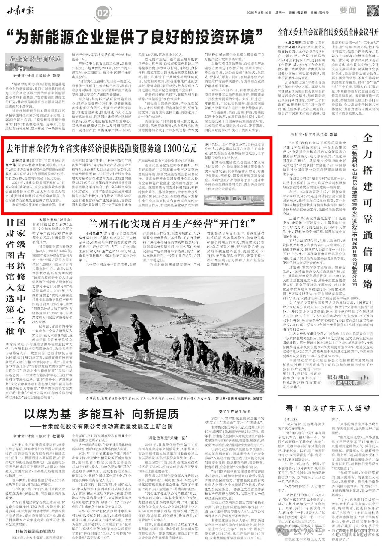 2024年,甘肃金控集团不断扩大“财政+金融”政策效应,充分发挥多业务板块金融服务协同优势,加大对全省重大战略、重要领域和薄弱环节的金融服务,为全省经济高质量发展提供了有力支撑。