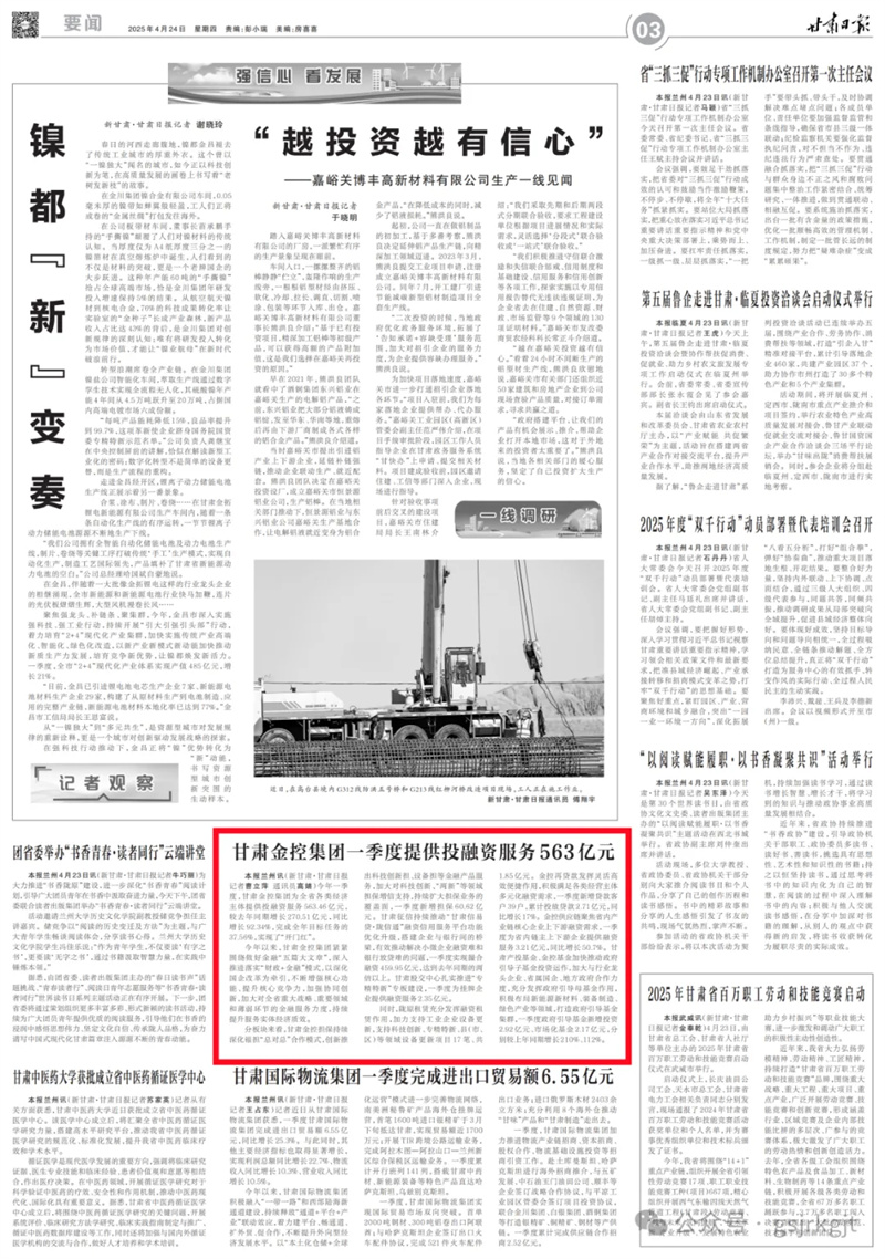甘肃金控集团一季度提供投融资服务563亿元