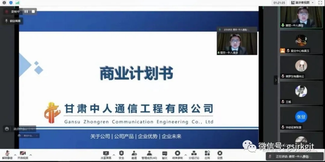 路演现场,甘肃元生农牧科技有限公司、甘肃普罗生物科技有限公司、甘肃中人通信工程有限公司3家企业依次进行项目介绍,中新知识城基金副总裁、投资总监楼海光,鼎盛信和(北京)投资管理有限公司合伙人陆光璞两位点评嘉宾,以及与会的投资机构分别就重点关心问题与企业进行了在线问答和沟通交流,从专业投资人的角度对项目进行点评分析并提出投融资建议。