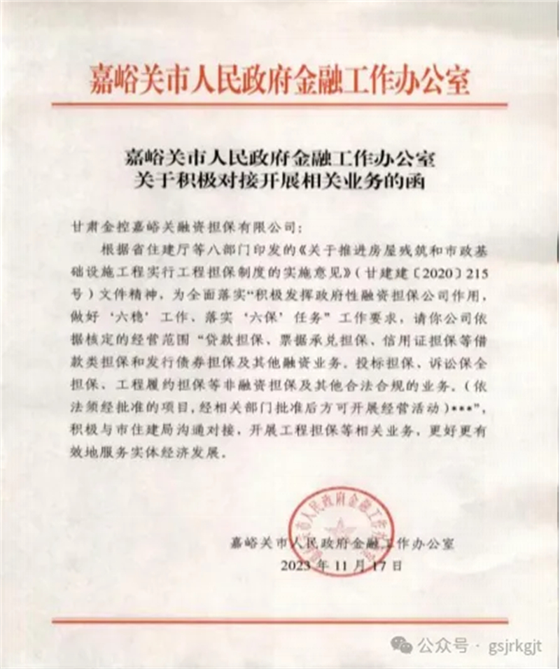 金控嘉峪关担保公司通过开展履约保函等工程担保业务,在助力强化建筑领域风险管理和建立健全建筑市场诚信机制中充分发挥政府性融资担?;怪澳?,为更好服务地方实体经济发展努力贡献自身力量。