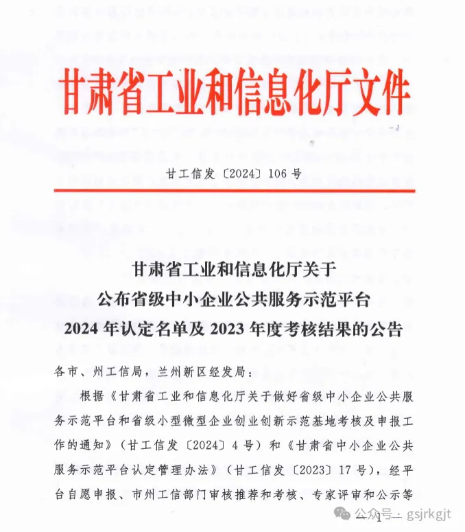 近日,甘肃省工信厅公布了《关于公布省级中小企业公共服务示范平台2024年认定名单及2023年度考核结果的公告》,甘肃股权交易中心在128家省级中小企业公共服务示范平台考核中荣获“优秀”等次。