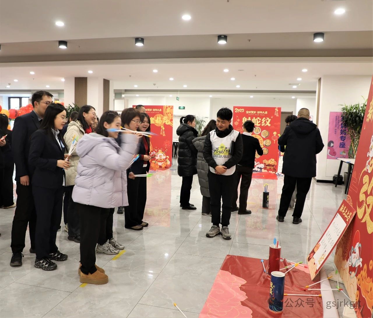 随着铿锵有力的锣鼓声,两只威武灵动的“祥瑞金狮”跃入会场,拉开活动序幕,在舞狮队员辗转腾挪间,集团公司领导执笔点睛,寓意新年开新局。随后开展的“古韵新潮”游戏区人声鼎沸,投壶游戏中的“上上签”破空声与欢呼声此起彼伏,“射箭”靶场选手凝神静气“百步穿杨”,“钓鱼”现场锦鳞翻飞笑闹如潮,套圈环节精准抛掷欢呼雀跃,冰壶赛道上更是上演“智谋对决”,团队协作的默契充分展现。现场气氛热烈,欢笑与掌声交织出欢乐的海洋。